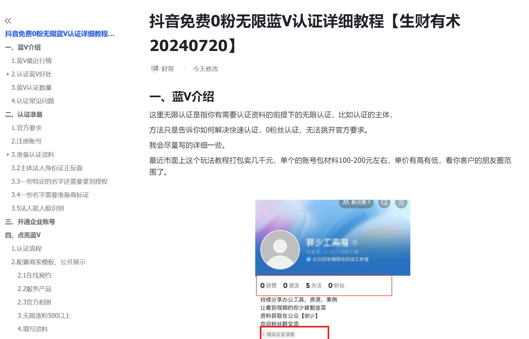 【13665】抖音蓝V免费0粉无限账号认证教程【生财有术20240720】