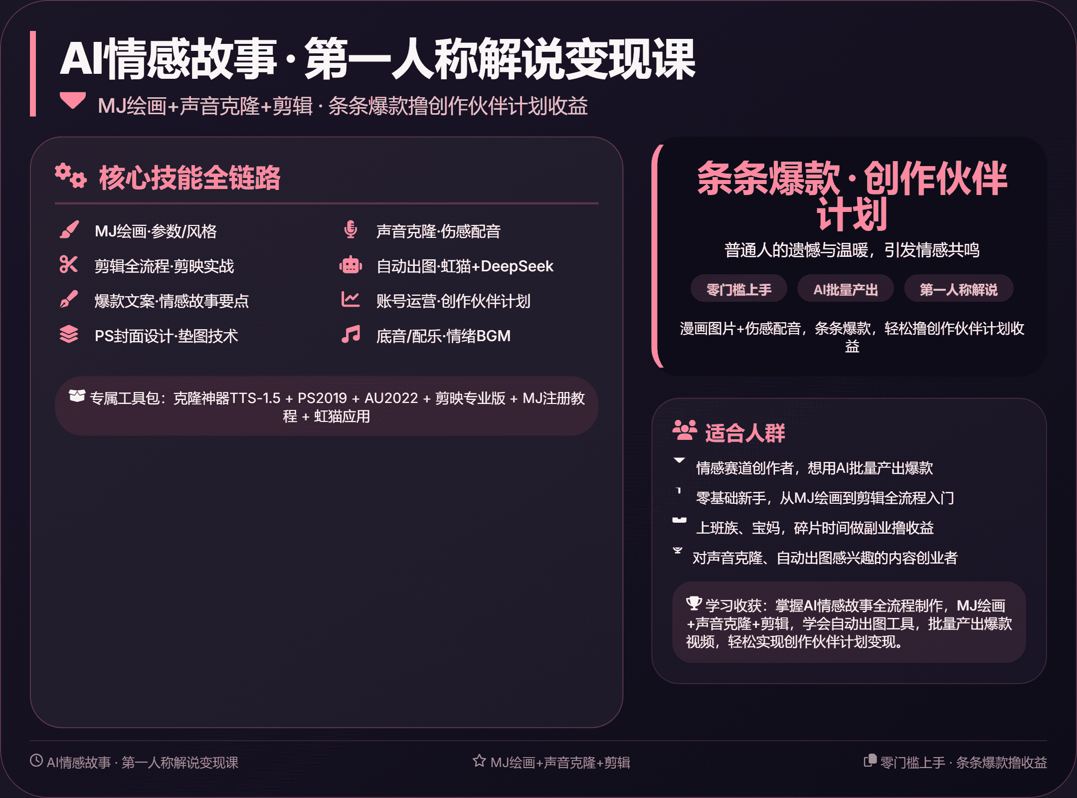2. 零基础新手,需从MJ绘画到剪辑全流程入门。