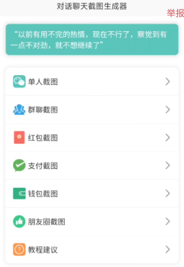 软件主要功能有:聊天截图、群聊截图、红包截图、支付截图、钱包截图、朋友圈截图生成。软件完全免费,很好用。