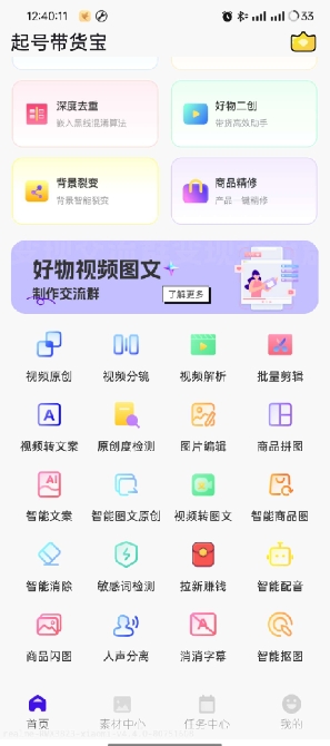【资源介绍】:起号带货宝是一款专为电商和带货推广设计的多功能手机应用,旨在帮助用户轻松创建和管理带货内容。该软件集素材混剪、图片编辑、商品抠图、智能去水印、商品拼图、闪图等功能于一体,适合各类用户,从新手到专业带货主播都能找到合适的工具来提升他们的带货效果。