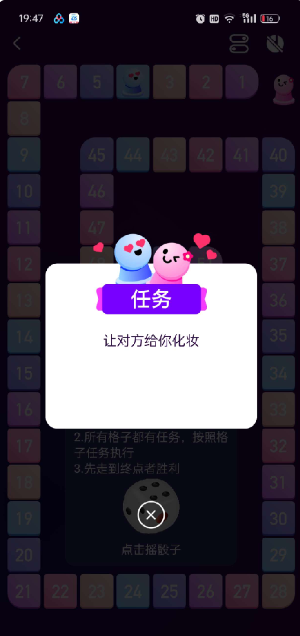 情侣飞行棋:专为情侣打造的飞行棋,简单易懂,界面直观,还可以自己选择难度,棋面上每一步都有一个小任务,通过掷骰子,落在相应数字的格子上则需执行对应格子的任务每一个小游戏都是增进你们感情的一小步。