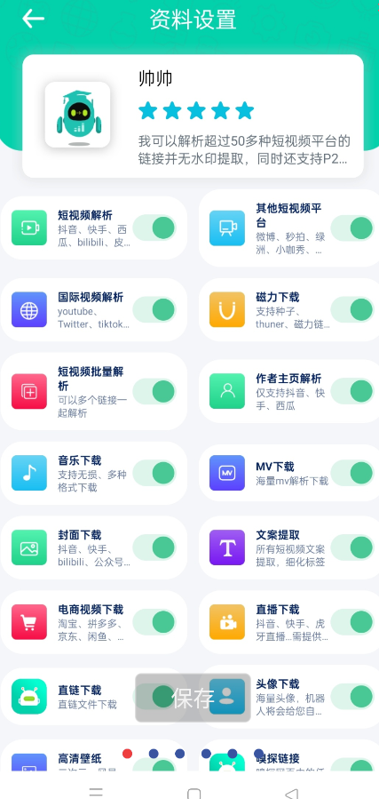 2. 支持超过 50 多种功能:这款 APP 支持超过 50 多种功能,包括音乐下载、封面下载、电商视频下载、直链下载、高清壁纸、蓝奏云下载、MV 下载、直播下载、头像下载、方案提取、嗅探链接、主流短视频解析、其他短视频平台解析、国际视频解析、磁力下载、短视频批量解析、作者主页解析等。无论你需要解析哪种类型的内容,这款 APP 都能满足你的需求。