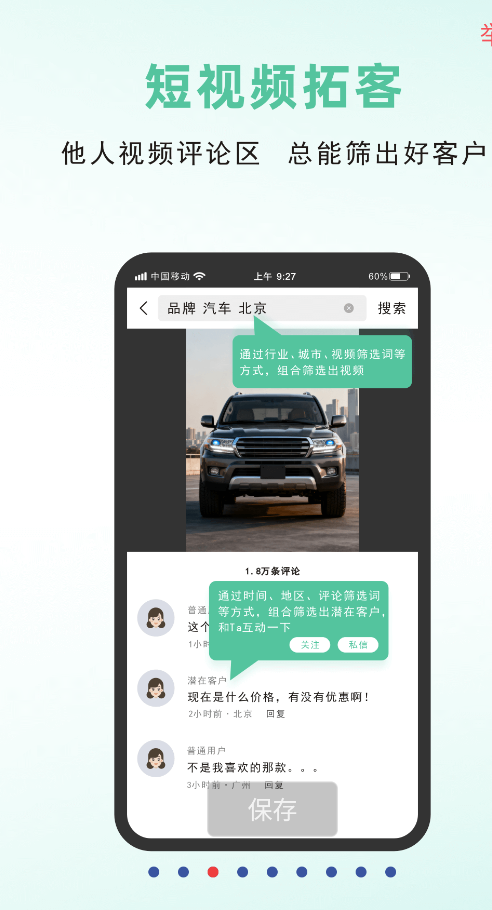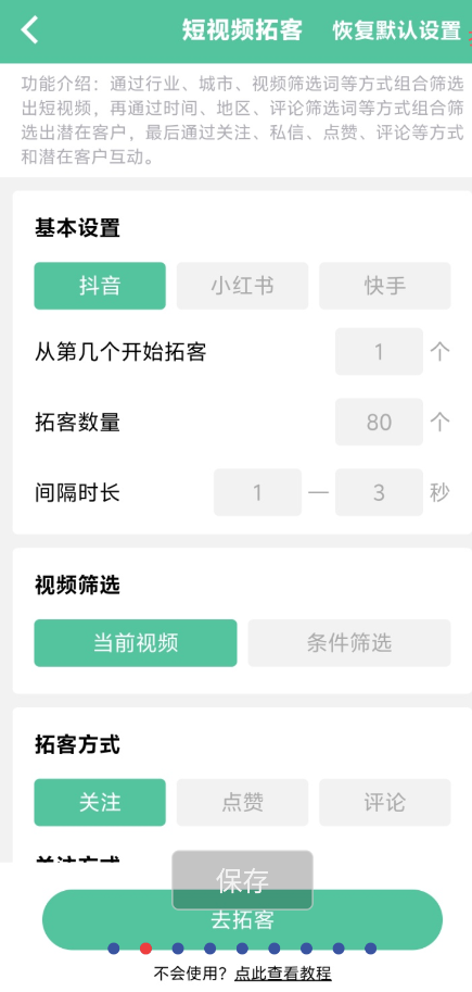 【短视频拓客】:先通过行业、城市、视频筛选词等方式组合筛选出短视频,再通过时间、地区、评论筛选词等方式组合筛选出潜在客户,最后通过关注、私信等方式和潜在客户互动;